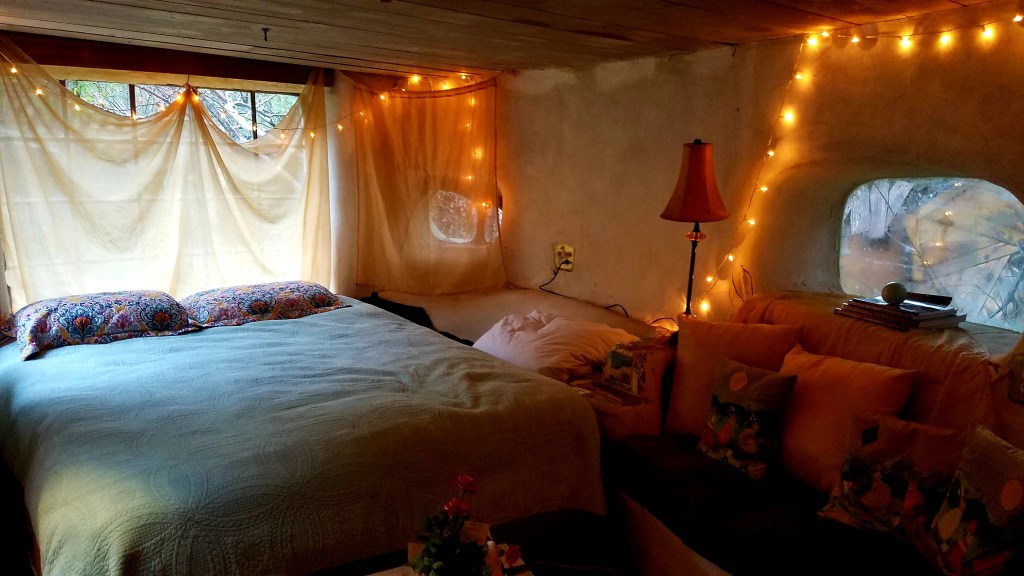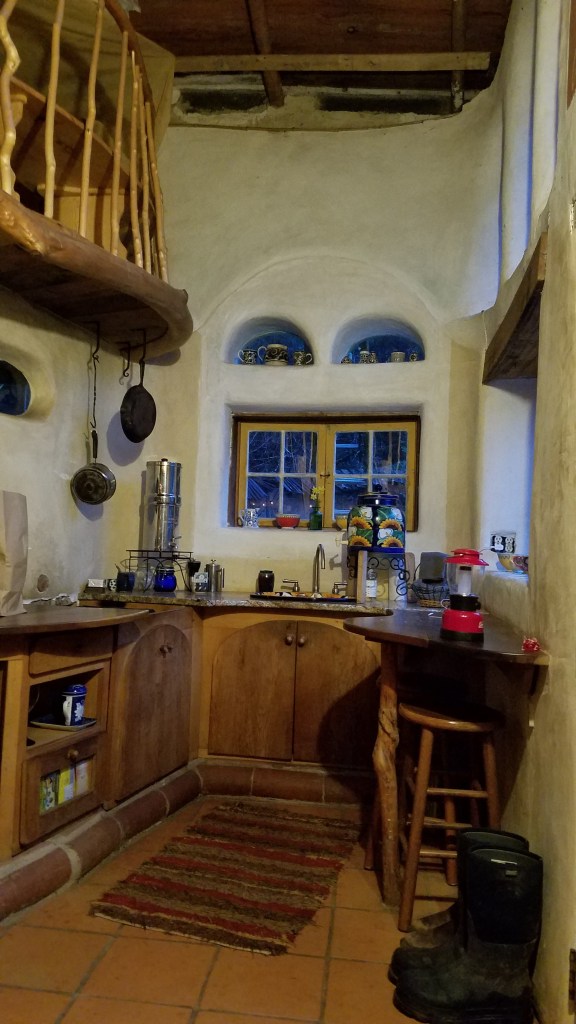 Before going to bed, Linda drops by to light a fire in a small rocket heater that warms things up a bit. The comfy bed had enough blankets to effectively keep us pinned down and still during the night. I’ve added pictures because it’s impossible to adequately describe the place without them.