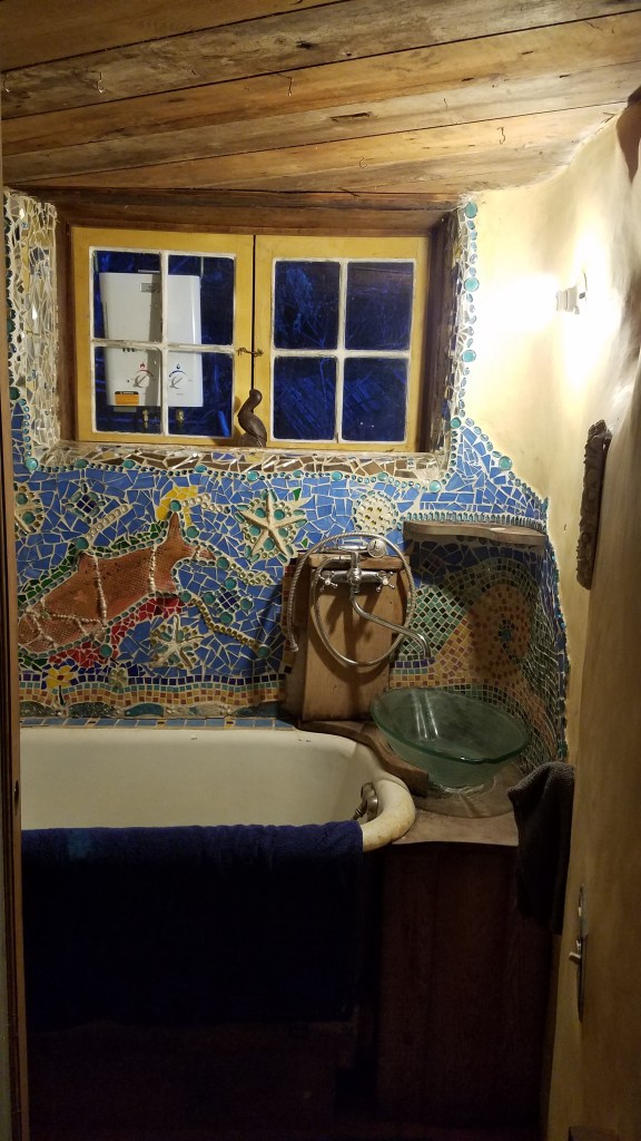 Our Cob house looked like something out of Hobbitville. Twinkle lights sparkled in our living room from solar energy, hand-applied baubles became art on the bathroom wall. The fireplace, bench seats, walls, and floor, are all hand-formed and made out of Cob.