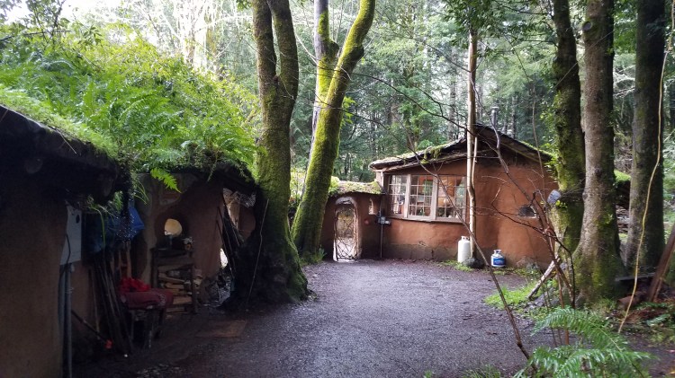 Soooo… back to the Cob Village. Instructions were to bring rubber boots, flashlights, layers of warm clothing, and drinking water. I’m nervous cause this sounds a lot like camping to me! The directions took us to the far outskirts of a small Southern Oregon town. Deep into the woods where no cell phone, electricity, working toilets, or coffee machine dare to function. Basically it’s nature, mud and Big Foot. After the last and final gravel road, we came to a clearing where we parked, gathered our stuff, and hiked in. (The picture below is the bridge and entrance to Cob Village)
