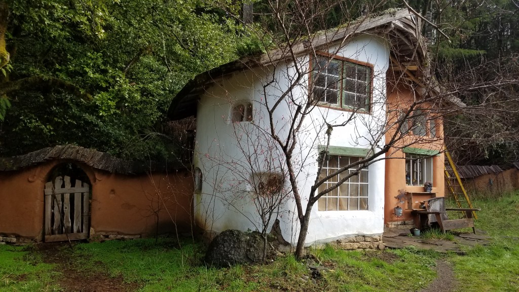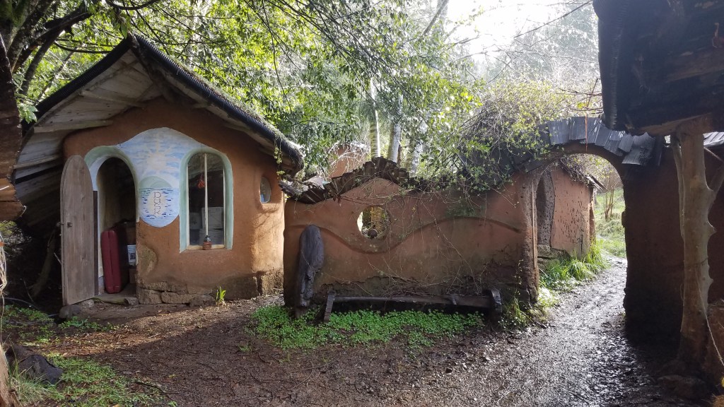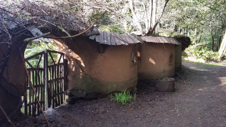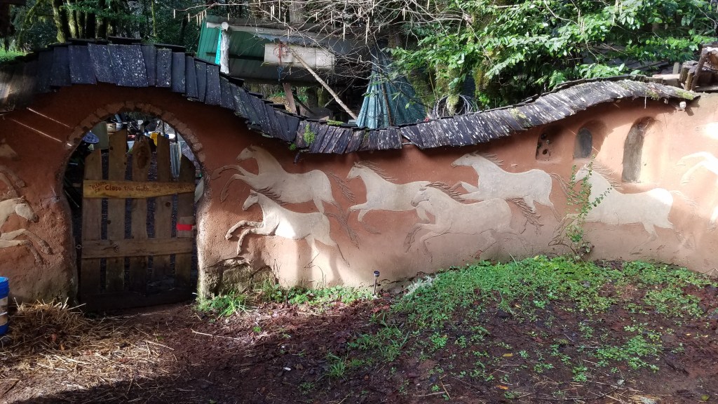 Narrow gravel muddy paths lead you past winding Cob walls, fairy-tale-houses, and other structures, many in the process of being finished. Artful gates designed with winding twigs and branches, roofs alive with grass, ferns and other foliage. Amazing!